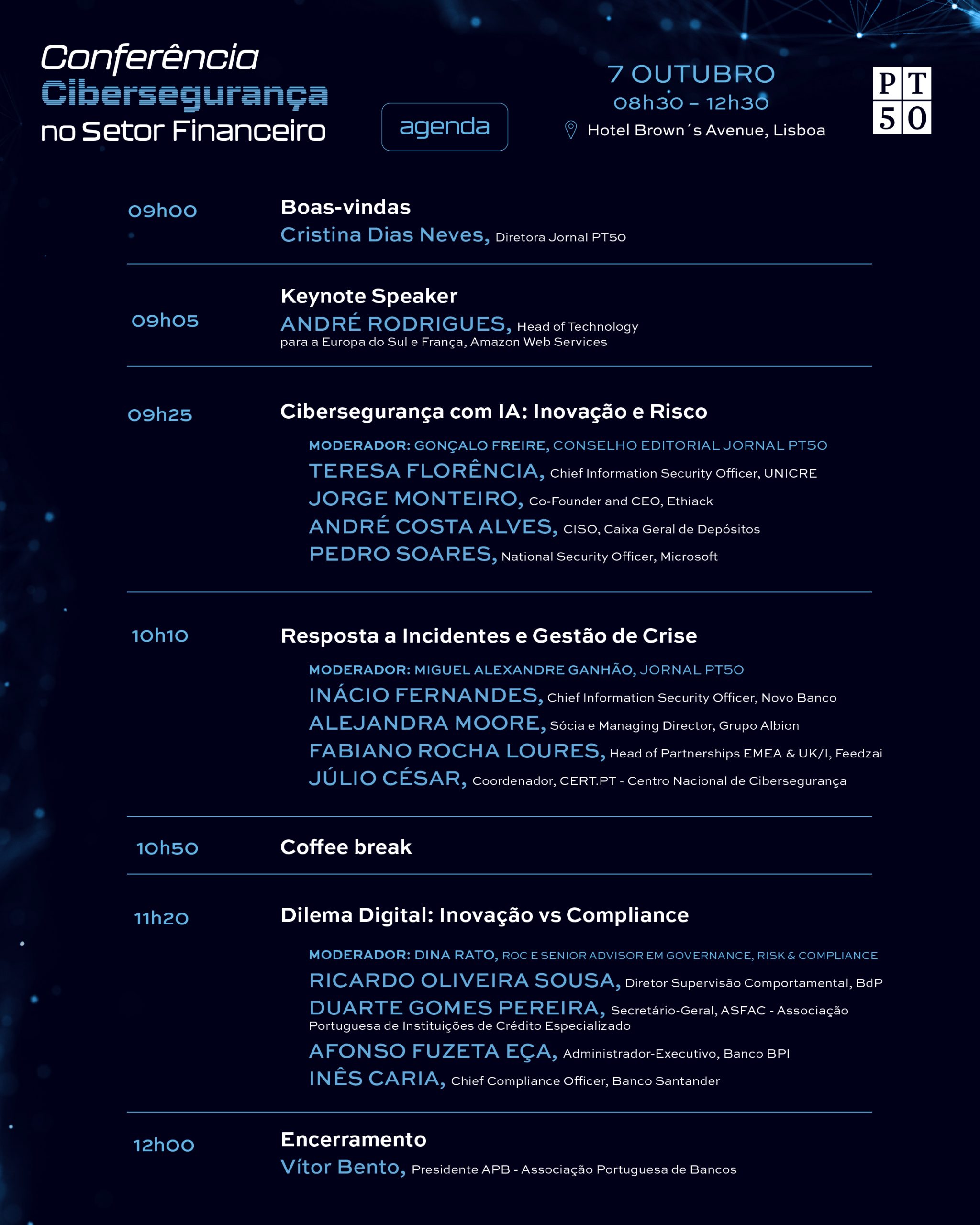 A decorrer numa manhã no hotel Brown´s Avenue Lisboa, a conferência pretende ser também uma oportunidade para partilhar experiências, promover a colaboração entre diferentes atores do setor e explorar soluções inovadoras que reforcem a resiliência e a confiança no ecossistema financeiro.